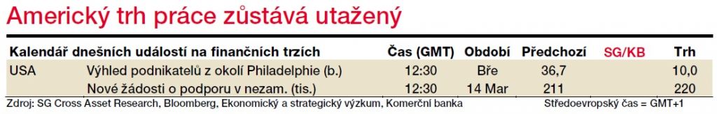 Dnešní americká data jsou spíš druhého řádu. Nové žádosti o podporu v nezaměstnanosti potvrdí, že americký trh práce zůstává silný a ekonomika se o něj může opřít. Výhled podnikatelů z Philadelphie již bude ovlivněn šířícím se koronavirem. Včera se kurz dostal na dosah důležité technické úrovně 1,08 USD/EUR, která před měsícem podržela a bude dalšímu pádu eura bránit i nyní.