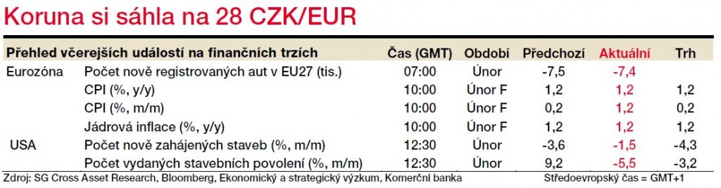 Naprosto nezajímavý ekonomický kalendář znamená, že finanční trhy budou i dnes ve znamení sledování informací o šířící se pandemii koronaviru, respektive budou lačné po informacích ze strany centrálních bank či vlád. Ta česká včera oznámila razantní balíček, klíčové ale budou detaily, struktura cílené pomoci. Centrální banka se k měnové politice sejde příští týden, kde čekáme snížení sazeb o 50 bb. Nelze ale vyloučit, že se měnovou politikou bude zabývat i dnes, kdy je v plánu neměnové zasedání. Velmi snadno se může změnit na měnové. Dopady koronavirové pandemie nejen na českou ekonomiku a tuzemské finanční trhy podrobněji diskutujeme ve speciálním vydání Ekonomických výhledů zde.
