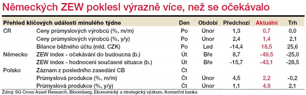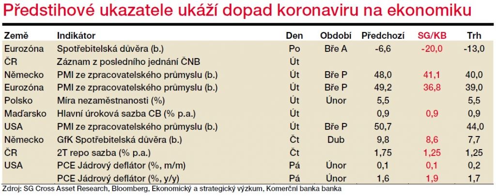 Většina Evropy začíná být pod karanténou a o k obdobným krokům přistupují i jednotlivé státy v USA. Fed, ECB a dalších centrální banky již přišly s agresivním uvolňováním měnových podmínek. Tento týden by tak měl být z tohoto pohledu klidnější. Z ekonomického hlediska však uvidíme další předstihové ukazatele, které naznačí, jak drtivé jsou dopady uvalených opatření. Na domácí půdě však ČNB ještě zdaleka neřekla své poslední slovo. Očekáváme, že čtvrteční jednání přinese další snižování úrokových sazeb a odhalí detaily případného zásahu centrální banky na devizovém trhu.