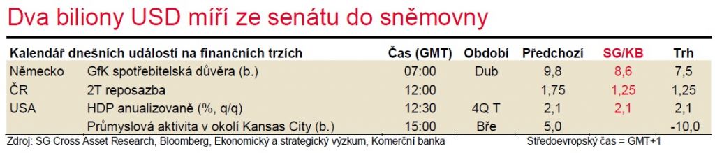 Hlavní veličinou na finančním trhu zůstanou statistiky související s dopadem pandemie. Akciový trh má za sebou dva dny růstu, k čemuž výrazně dopomohly mohutné měnové a fiskální stimuly. Mamutí fiskální impuls v podobě dvou bilionů dolarů (cca 10 % HDP) byl včera schválen americkým senátem v poměru hlasů 96-0 a návrh bude dále schvalován dolní komorou již zítra. President Donald Trump vyzval Kongres k jeho urychlenému přijetí s tím, že on jej následně okamžitě podepíše. Již nyní se diskutuje o dalších opatřeních, pokud ta stávající nebudou stačit. Japonsko zvažuje vyhlášení stavu ohrožení poté, co narostl počet výskytu nakažených. Asijské akciové trhy dnes většinou mírně klesají. Akciové futures v USA a Evropě se pohybují smíšeně. Z makroúdajů dnes bude stát za pozornost vývoj spotřebitelské důvěry v Německu, která již vlivem pandemie zřejmě klesá. Finanční trhy pravděpodobně nadále budou velmi volatilní.