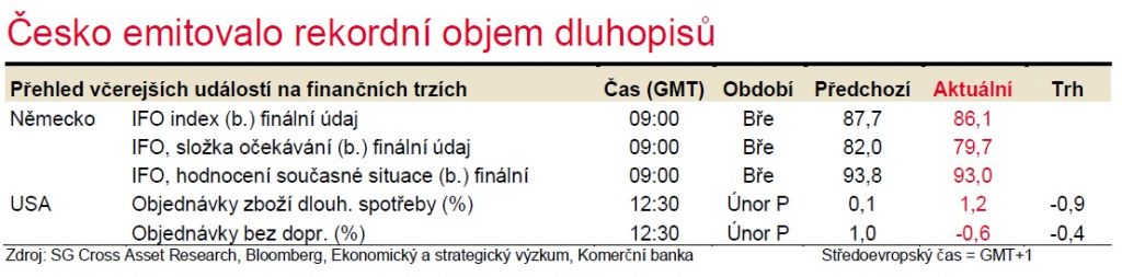 Čekáme, že ČNB na dnešním zasedání sníží hlavní úrokovou sazbu o dalších 50bp na úroveň 1,25 %, což je přibližně i očekávání peněžního trhu. Blíže k výhledu na ČNB viz komentář Martina Gürtlera zde. Důležité ale bude sledovat vyjadřování ČNB ohledně dalších kroků včetně plánované možnosti nákupu vládních dluhopisů. Včerejší dluhopisová aukce indikuje, že by ČNB tento nástroj vůbec nemusela použít, pokud ovšem situace nebude dále výrazně eskalovat.