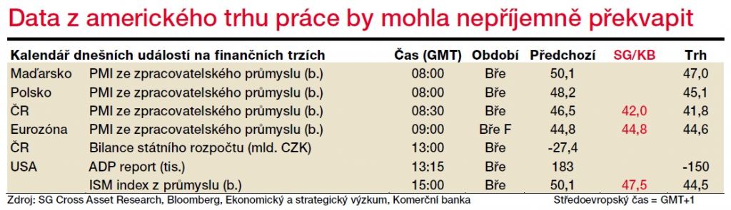 Na datové frontě nás dnes čeká zveřejnění amerického březnového ISM indexu. Ten sice skončí pod 50bodovou hranicí, propad by však neměl být dramatický. V eurozóně to budou finální indikátory PMI z oblasti průmyslu, které budou zřejmě potvrzeny na úrovni předběžného odhadu. Zatímco Čína už má nejhorší za sebou, regionální PMI indikátory čeká další propad. Zajímavý bude i pohled na český státní rozpočet, kde by již dopady koronaviru měly být vidět.