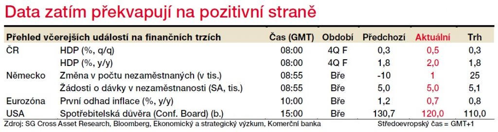 Zhoršení se tedy německý trh práce ještě určitě dočká. Pozitivně překvapila i březnová spotřebitelská důvěra ve Spojených státech. Ta skončila deset bodů nad očekáváním trhu. Akciové trhy těžily z dobrých dat, která přišla z Číny. Březnový index PMI z průmyslu i služeb nečekaně vyskočil nad 50bodovou hranici. To však neznamená návrat ke stavu před