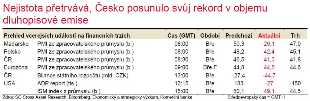 Včera zveřejněné předstihové indikátory potvrdily, že zatímco čínská výrobní aktivita se v březnu mírně zvýšila, v západních ekonomikách a ve střední Evropě naopak klesá. Akciové trhy v Evropě i USA zahájily druhé čtvrtletí poklesem kolem cca 3-5 %. Česká koruna proti euru včera oslabila k hladině 27,60 CZK/EUR, a poté posílila o 10 hal. Dolar posílil k 1,091 USD/EUR a dnes začíná poblíž 1,095 USD/EUR.