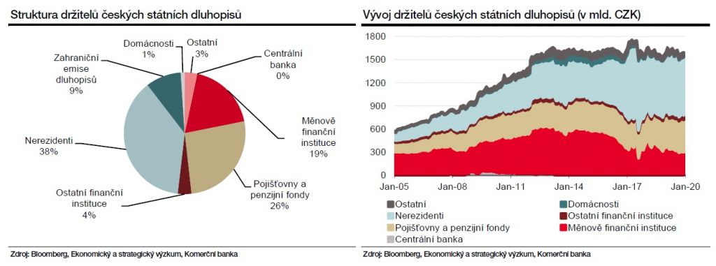 Očekáváme také, že by díky nákupům centrální bankou došlo ke změně struktury držitelů českých státních dluhopisů. Lze předpokládat, že stejně jako v případě eurozóny by nejvíce prodávaly dluhopisy zahraniční investoři. Ke konci února drželi 40,8 % všech stáních dluhopisů. Tento poměr v posledních týdnech pravděpodobně klesl, i tak ale zůstává nadprůměrný. Na druhou stranu by se zvýšila držba bank a finančních institucí, které kupují dluhopisy i z regulatorních důvodů a mohou je použít jako zajištění pro dodávací operace s centrální bankou.