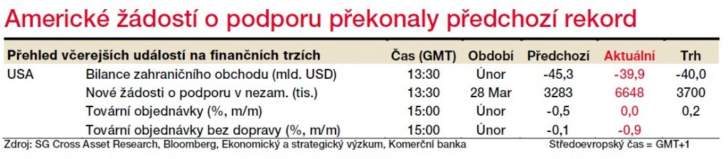 Včerejší údaje o nových žádostech o podporu v nezaměstnanosti v USA slouží jako předpoklad pro dnešní měsíční statistiku z trhu práce. Ještě před zveřejněním těchto čísel jsme očekávali březnový zánik pracovních míst o 150 tis., zatímco konsenzus trhu počítá s propadem pouze o 100 tis. Po včerejšku však lze předpokládat, že výsledek bude horší.