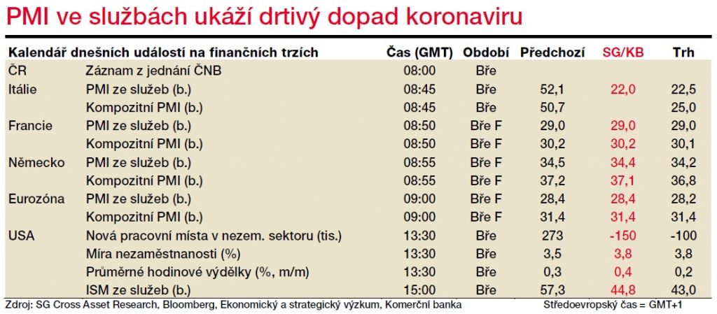 Nové žádosti o podporu v nezaměstnanosti v USA opět lámou rekordy a několikanásobně překonávají své historické průměry. Dnes obrázek amerického trhu práce za březen doplní měsíční statistika změny pracovních míst. Ačkoli sběr dat pokrývá pouze první polovinu měsíce, očekáváme výrazný propad, a to i ve srovnání s trhem. PMI ze Španělska a Itálie potvrdí drtivý dopad koronaviru na sektor služeb. Hlavní propad předstihových ukazatelů však očekáváme až v dubnu.