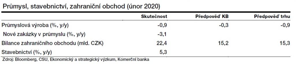 Průmyslová produkce v únoru meziročně poklesla o 0,9 %, což bylo v souladu s mediánovým odhadem analytiků. Za tím stála především nižší produkce v energetickém průmyslu. Ve váhově nejvýznamnějším zpracovatelském průmyslu produkce naproti tomu meziročně vzrostla o 0,3 %. To bylo dáno zejména nárůstem výroby v automobilovém průmyslu, který tak kompenzoval pokles produkce v průmyslu strojírenském. Únorová data průmyslové produkce však zatím nic neříkají o dopadech preventivních opatření proti šíření koronavirové infekce, která byla zavedena v průběhu března. Lze tak očekávat, že březnová čísla ukáží na výrazný pokles průmyslové výroby, a to v prvé řadě vlivem přerušení produkce v automobilovém průmyslu. Hodnota nových průmyslových zakázek se v únoru meziročně snížila o 3,1 %.