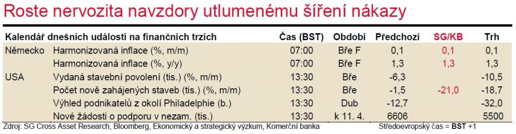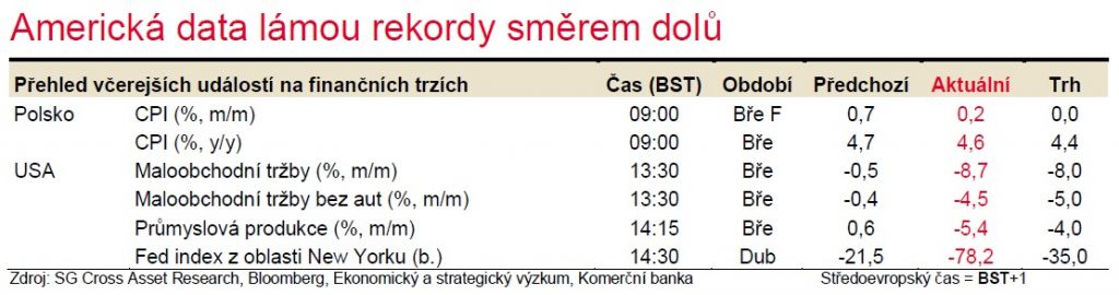 Nově zveřejněná makroekonomická data v USA náladě na trzích ovšem spíše uškodila. Maloobchodní tržby USA v březnu meziměsíčně klesly o 8,7 %, což je nejhlubší propad v této časové řadě, která se datuje od roku 1992. Růst o 25,6 % m/m zaznamenal prodej potravin s tím, jak se lidé předzásobovali. Průmyslová výroba klesla meziměsíčně o 5,4 %, když se čekalo -4,0 %. To jsou ovšem data za březen. Je jasné, že v dubnu přijde další pokles, a na ten ukazují předstihové indikátory. Newyorský Fed index aktivity ve výrobě klesl na skutečně děsivou hodnotu -78,2 bodu z předchozích -21,5 b., když se čekal pokles na „pouhých“ -35,0 b, tedy zhruba úroveň dosahovanou během krize roku 2009. Pod odhady se propadla i nálada stavitelů domů NAHB. Fakt, že řada ukazatelů nyní bude vykazovat mnohem horší údaje než v průběhu krize 2008-2009, je principiálně dáno povahou současné recese, která je fakticky ze dne na den dána rozhodnutím o omezení aktivity v řadě oborů. Ze stejného důvodu je zde ale velká šance na rychlé oživení.