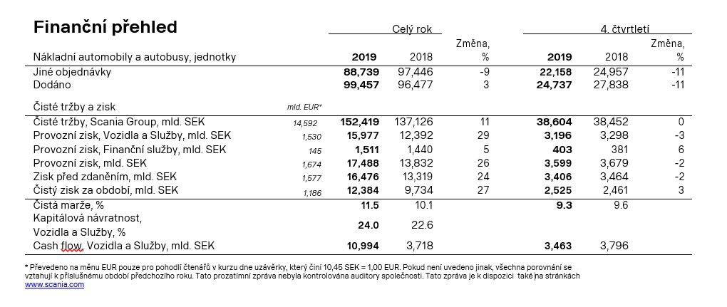 Rok 2019 byl rokem pokračujícího růstu a ve společnosti Scania jsme v něm dosáhli mnoha rekordů. Dodávky vozidel dosáhly historicky nejvyšších úrovní, stejně jako je tomu u služeb. Čisté tržby činily rekordně vysokých 152,4 mld. SEK, což znamená 11% nárůst oproti předchozímu roku. Zisk byl historicky nejvyšší na úrovni 17,488 mld. SEK. Provozní marže pak činila 11,5 %. Vyšší objem u vozidel a služeb, dopady měnových kurzů i tržní mix, to vše přidalo svůj pozitivní příspěvek k našim výsledkům. Výnosy ze služeb se zvýšily o 9 procent na 28,9 mld. SEK. Provozní zisk za finanční služby byl na rekordně vysokých 1,511 mld. SEK.