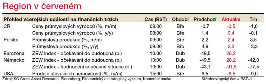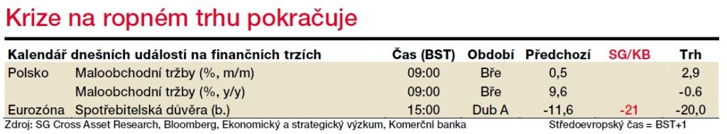 Dubnová spotřebitelská důvěra v eurozóně podle našeho odhadu propadne z březnových -7,2 bodu na -21 bodu. Svého dna na úrovni -35 bodů, kde se nacházela v období velké finanční krize, ale ještě nedosáhne. Ve Spojených státech dnes žádná data zveřejněna nebudou.