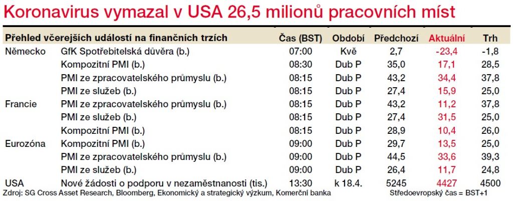 Americký trh práce pokračuje v likvidaci pracovních míst. Za posledních pět týdnu poslal 26,5 milionů lidí na pracovní úřad žádat o podporu v nezaměstnanosti. Tento vývoj tak implikuje dubnový nárůst nezaměstnanosti nad deset procent. Obdobné zprávy jsme v průběhu včerejška viděli i v Evropě. Německá spotřebitelská důvěra klesla v dubnu na -23,4 bodu, zatímco během poslední krize se stejný indikátor nedostal ani do záporných hodnot. PMI z eurozóny potvrdila rekordní propad v sektoru služeb, zatímco průmysl ukázal jistou míru odolnosti v současné krizi.