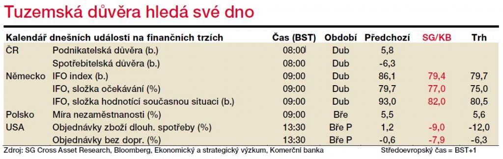 Tuzemská spotřebitelská i podnikatelská důvěra hledá své dno současné krize. Obdobě jako v zahraničí očekáváme, že největší propad zaznamená sektor služeb. Pokles sentimentu by měl ukázat i německý IFO index za duben. Březnové objednávky zboží dlouhodobé spotřeby v USA ukážou výrazný propad, největší pokles však očekáváme až v dubnu. Koruna se vrátila ke své krátkodobé rovnováze a v současnosti je podle nás jen o desetník podhodnocená.