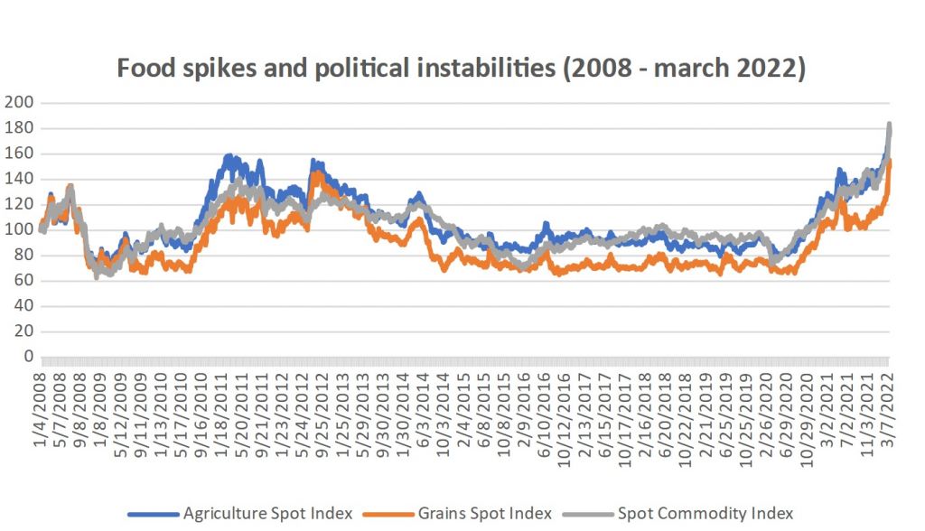 Je zřejmé, že došlo k nárůstu během globální finanční krize, která v roce 2009 odezněla. K dalšímu nárůstu došlo během arabského jara (prosinec 2010 - prosinec 2012). V důsledku expanzivní fiskální a měnové politiky a spekulací Fedu došlo k prudkému nárůstu cen. Během krize COVID-19 byl nový nárůst cen způsoben fiskálními stimuly v některých zemích, ultra uvolněnou měnovou politikou, hromaděním zásob a omezením vývozu ze strany některých zemí.