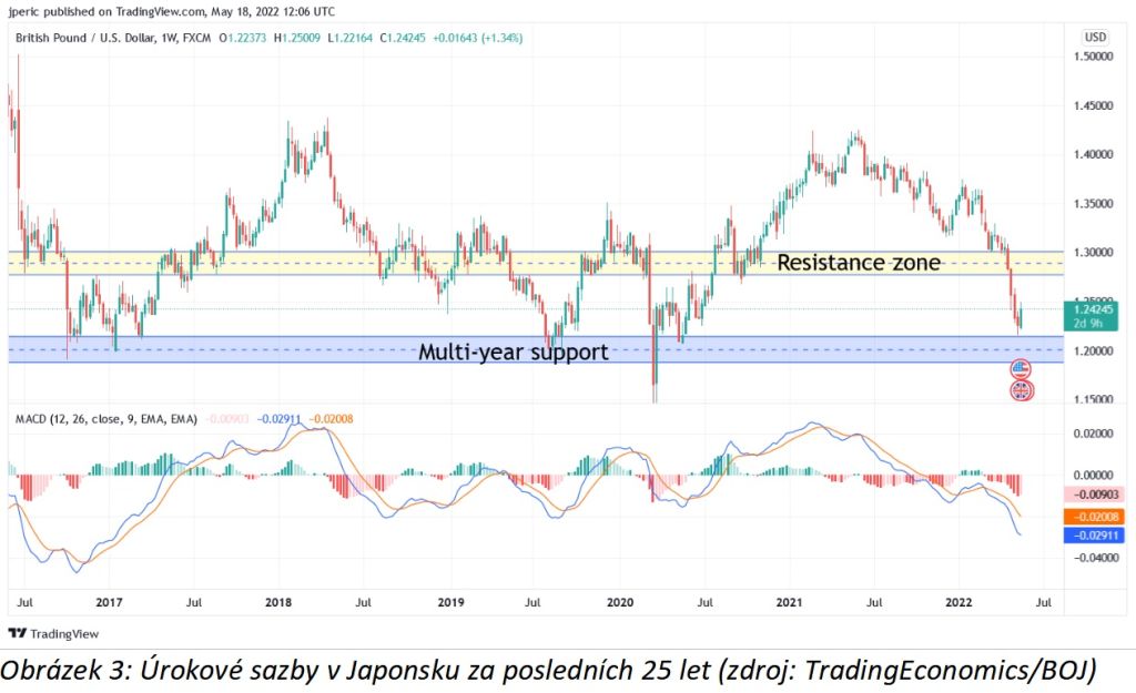 Měnový pár GBPUSD se blíží víceleté podpoře (modrá barva na obrázku 3). Pokud se linie podpory udrží a BOJ a americký FED budou pokračovat ve své očekávané politice, mohl by GBPUSD otestovat zónu rezistence 127-130 (žlutá barva na obrázku 3).