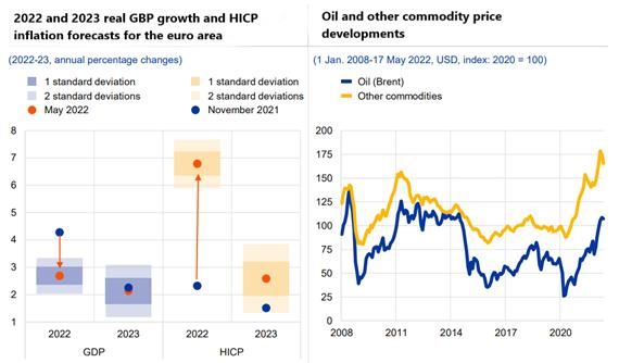 ECB očekává, že inflace v eurozóně dosáhne v roce 2022 průměrné úrovně 6,1 % a v roce 2023 klesne na 2,7 %. Ve srovnání s průběžnou zimní prognózou pro rok 2022 jde o výrazně vyšší predikci (původně 3,5 %). Inflace by měla vyvrcholit v aktuálním, druhém čtvrtletí na úrovni 6,9 % a poté postupně klesat. V celé EU jsou čísla o něco vyšší: z úrovně 2,9 % v roce 2021 se čeká nárůst na 6,8 % v letošním roce a poté pokles na 3,2 % v roce 2023. V EU i v eurozóně se odborníci shodují na tom, že průměrná jádrová inflace v tomto a příštím roce překročí 3 %.