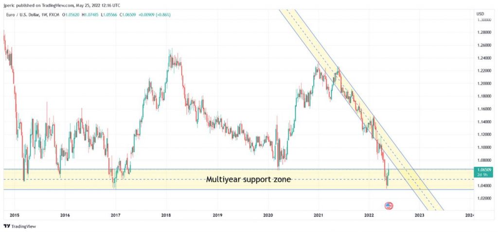 Jak stojí v této situaci euro vůči dolaru? Jak je vidět na grafu, kurz evropské měny vůči dolaru se nachází v zóně víceleté podpory. Podíváte-li se na čísla detailněji, je vidět, že kurz eura se odrazil ode dna a směřuje opatrně nahoru. Pokud by posilování eura pokračovalo v této trajektorii z posledních několika týdnů, mohlo by se euro dostat k zóně rezistence, kterou naznačuje další graf.