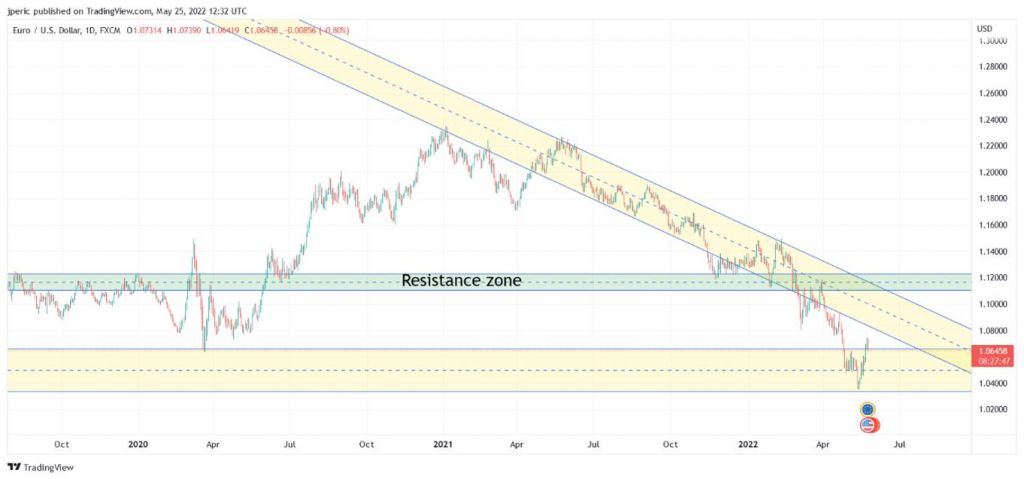 Při jakémkoli signálu nebo vyšší pravděpodobnosti, že by ECB mohla zvýšit úrokovou sazbu, bychom pravděpodobně mohli vidět růst kurzu eura nejen do oblasti zóny rezistence, ale případně i k rekordním úrovním 1,20-1,22 z roku 2021.