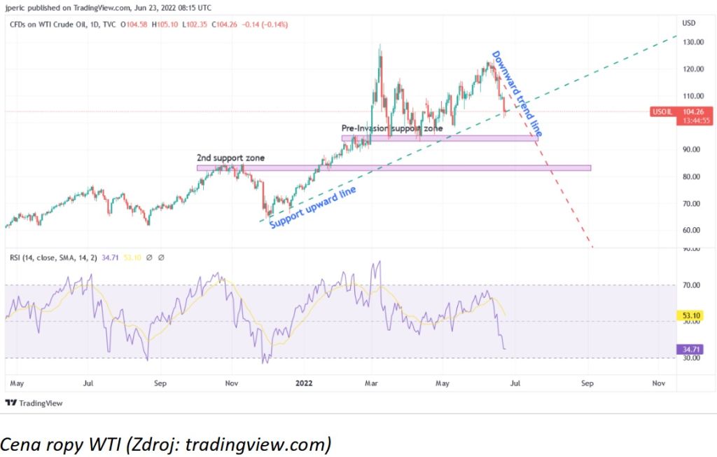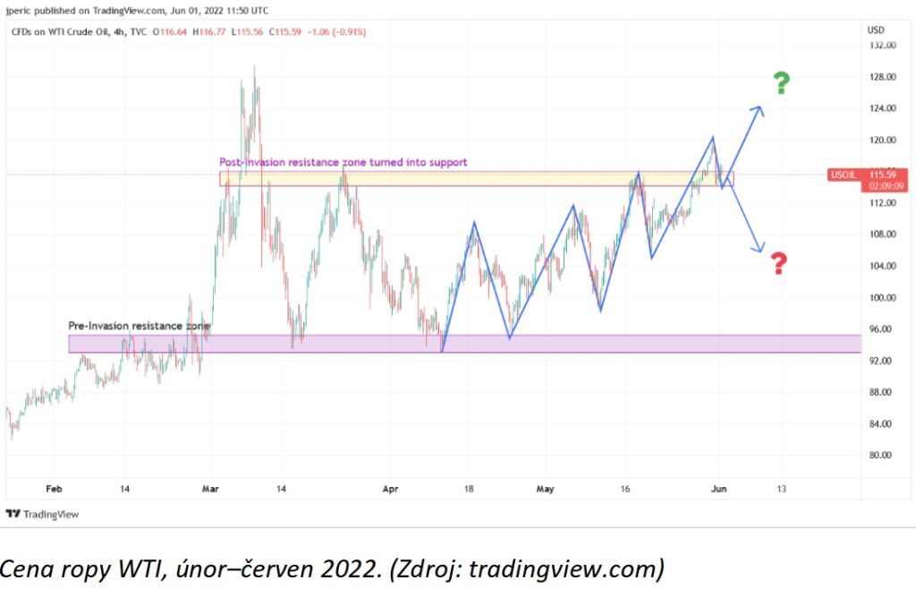 Po zrušení sankcí – jak je patrné z dalšího grafu – však cena ropy nabrala klesající trend, překonala zónu odporu po invazi a dosáhla ceny 104 USD.