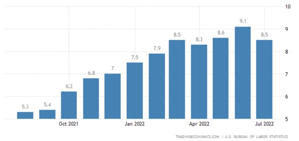 Euro od ledna oslabilo přibližně o 12 %, zatímco americký dolar stále roste. Podporou pro růst amerického dolaru bylo především nedávné zvýšení úrokových sazeb a kvantitativní zpřísňování zavedené Fedem, který bojuje s rostoucí inflací nejen v EU, ale i v USA a dalších částech světa. V červnu se zvýšila na 9,1 % a v červenci klesla na 8,5 %.