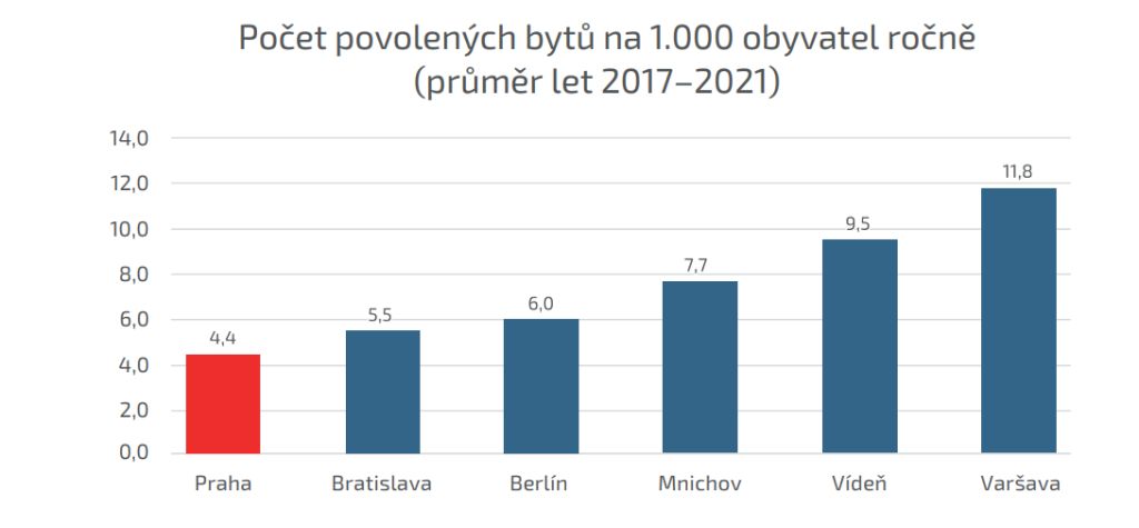 V červenci se v Praze podle aktuálních dat ČSÚ povolilo jen 279 nových bytů. Od ledna do července to pak bylo 2.594 nových bytů pro Prahu. Za celý rok by se povolilo jen kolem 4.400 bytů, což odpovídá průměru povolovanému v posledních 5 letech. V Praze je přitom v přípravě více než 134 tisíc bytů, to je bydlení pro zhruba 280 tisíc lidí. Celý balíček připravovaných bytů by současným tempem v metropoli trvalo povolit přes 30 let. Ve Varšavě nebo Vídni se přitom v přepočtu na tisíc obyvatel povoluje 2,5x až 3x tolik bytů co v Praze.