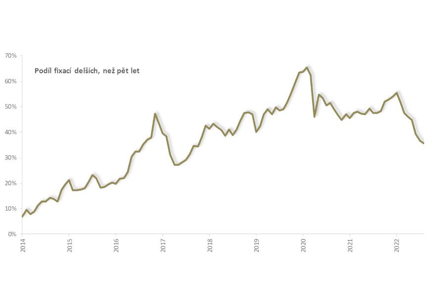 Naopak roste podíl kratších fixací. Pětileté fixace jsou zdaleka nejvyužívanější, ale vidíme i jasný růst fixací na jeden až tři roky.