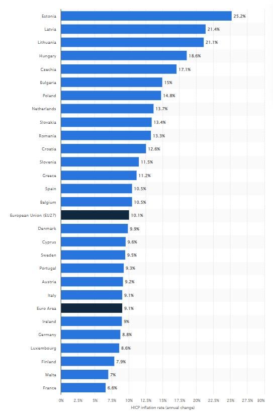Každý region má své vlastní specifikace. Přibližné hodnoty inflace v EU a ve Spojených státech se pohybují v rozmezí 8-9%. Rozdíly nacházíme především v přístupu k měnové politice a v boji proti inflaci. Federální rezervní systém musí čelit větší výzvě než Evropská centrální banka, o čemž svědčí nastavení klíčových úrokových sazeb.