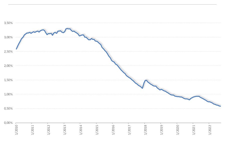 Jedinou optimistickou zprávou v oblasti hypotečních úvěrů tak je fakt, že podíl hypotečních úvěrů, které jsou ohroženy potížemi se splácením, se drží na historicky nejlepších hodnotách.