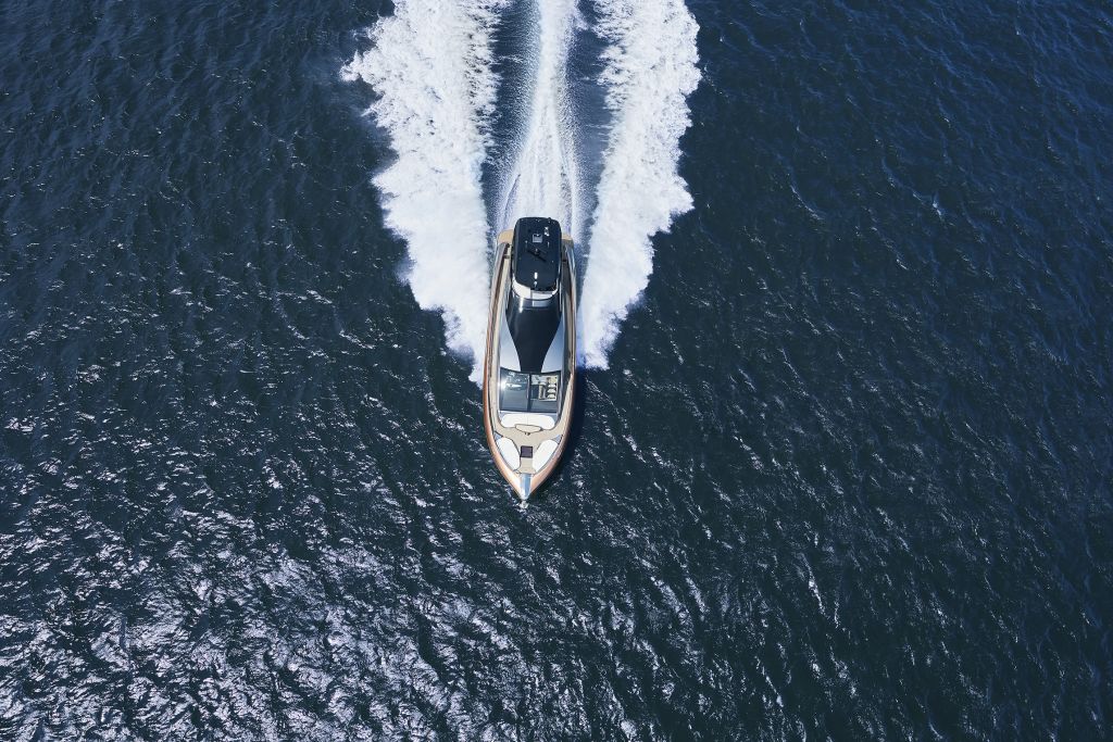 The premiere yacht features an optional two-tone color scheme that highlights its one-of-a-kind form and captures the image of the Lexus Sports Yacht Concept from 2017. Metallic accents on the bow, side windows, and the vessel's L-shaped air intakes create the iconic image of a Lexus yacht.