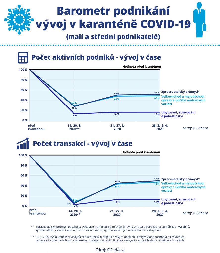 Společnost O2 eKasa zpracovala analýzu dat z třetího týdne po zavedení opatření souvisejících s koronavirem (28. 3. - 3. 4. 2020). Data byla získána porovnáním s údaji z posledních dvou týdnů před vyhlášením karantény. Analýza se týká podnikatelů, kteří používají řešení O2 eKasa.