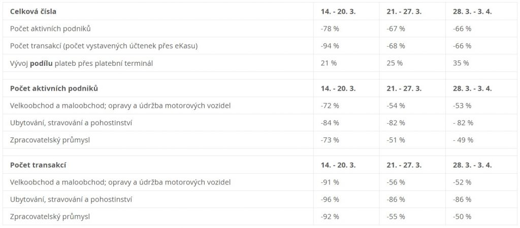 Z dat ze třetího týdne od zavedení karantény vyplývá, že všechna tři hlavní sledovaná odvětví (Velkoobchod a maloobchod, opravy a údržba motorových vozidel; Ubytování, stravování a pohostinství; Zpracovatelský průmysl) nezaznamenala ve třetím týdnu téměř žádný nárůst. Většina podnikatelů, kteří mohli a chtěli prodávat, pravděpodobně otevřela své obchody již druhý týden po zavedení vládních opatření a další vyčkávají na to, jak se situace bude vyvíjet.