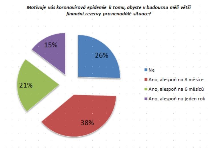 Z exkluzivního průzkumu pro Komerční banku vyplynulo, že tři čtvrtiny Čechů chtějí výrazně změnit své spořicí návyky. Na otázku - Motivuje vás koronavirová epidemie k tomu, abyste v budoucnu měli větší finanční rezervy pro nenadálé situace? - si chce alespoň tříměsíční finanční polštář vytvořit 38 % respondentů, půlroční 21 % a roční 15 %. Průzkum zpracovala agentura IPSOS na vzorku 1100 respondentů ve věku 18 – 65 let.
