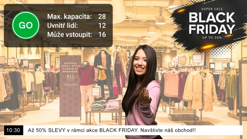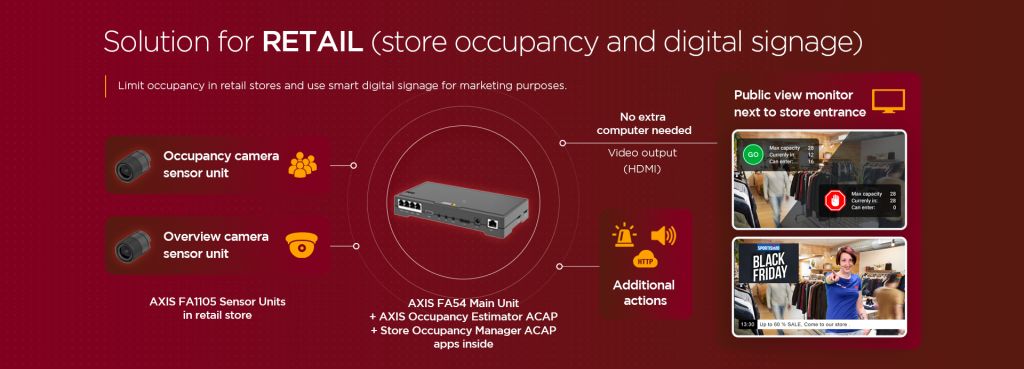 Softwarová aplikace s názvem Store Occupancy Manager se instaluje přímo do kamery Axis. Aplikace se spojí se softwarem pro počítání osob, následně z něj agreguje data o počtu lidí v prodejně a prostřednictvím srozumitelné infografiky je spolu s živým záběrem z prodejny zobrazuje příchozím zákazníkům na připojené LCD obrazovce. Zákazníci tak mají okamžitý přehled o tom, kolik lidí se na prodejně nachází a kolik jich ještě může vstoupit. V případě naplnění maximální kapacity pak aplikace další příchozí požádá, aby se vstupem do obchodu počkali. Mezitím jim nabídne novinky, informuje o slevách nebo změněné otvírací době. Grafiku lze jednoduše personalizovat a zobrazit jakékoliv informace, bannery i obrázky, včetně např. animovaných gifů.