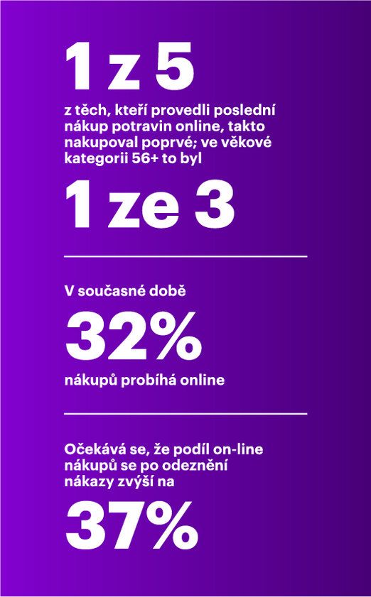 Není překvapivé, že více lidí nakupuje potraviny online. Jak průzkum ukázal, pětina z těch, kteří provedli poslední nákup potravin online, takto nakupovala poprvé. U starších respondentů to byl dokonce jeden ze tří. V současné době 32 % nákupů všech produktů a služeb probíhá online a očekává se, že se tento podíl v budoucnu zvýší na 37 %.