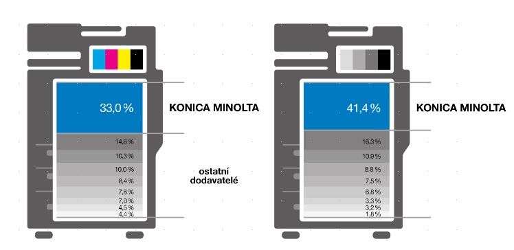 Tržní podíly Konica Minolta v ČR dosáhly v případě černobílých produkčních strojů 66,7 % a v segmentu barevných digitálních produkčních strojů 61,8 %. Na trhu barevných kancelářských multifunkčních zařízení formátu A3 činil podíl společnosti 33 %. U černobílých multifunkčních přístrojů formátu A3 pak dosáhla Konica Minolta tržního podílu 41,4 %. Třiadvacetiprocentní podíl trhu pak Konica Minolta drží v segmentech kancelářských multifunkčních tiskáren formátu A4.