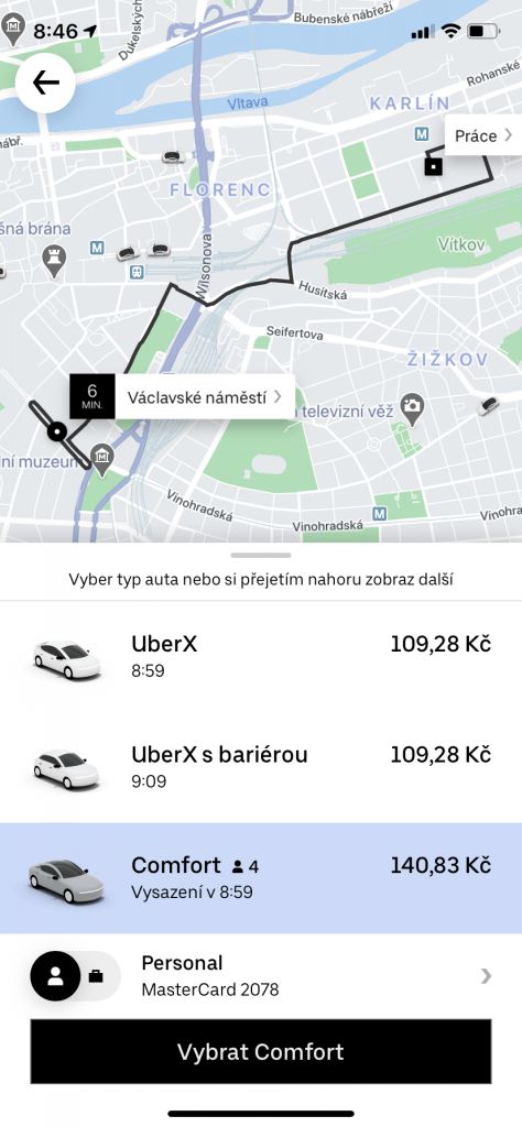 3. Namísto UberX vyberte možnost „Comfort”