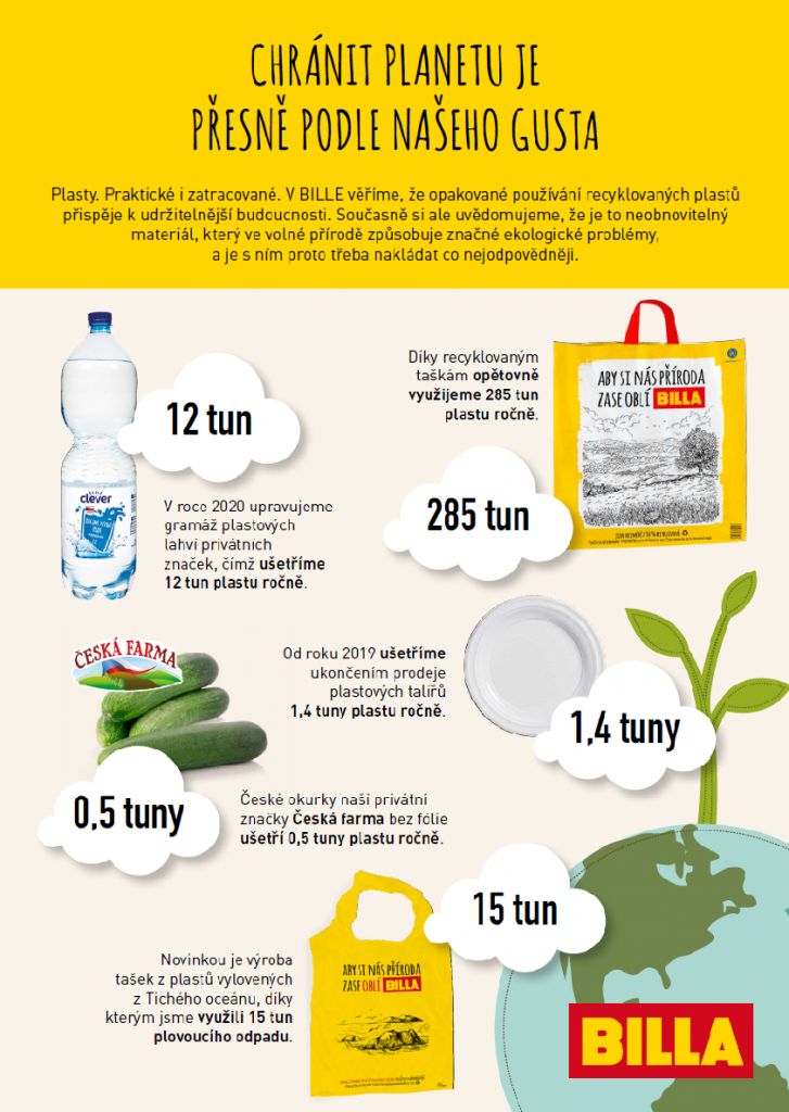 Společnost BILLA je rovněž aktivní v oblasti úspory plastu. V roce 2020 upravila gramáž plastových lahví jejích privátních značek, čímž má v plánu ušetřit až 12 tun plastu ročně. Další 1,4 tuny plastů společnost již ušetřila v roce 2019, kdy ukončila prodej plastových talířů. Klasické „igelitky“, které BILLA vyrábí z LDPE fólie z komunálního odpadu, a které firma zavedla už loni, pak pomohly ušetřit na 285 tun plastu.