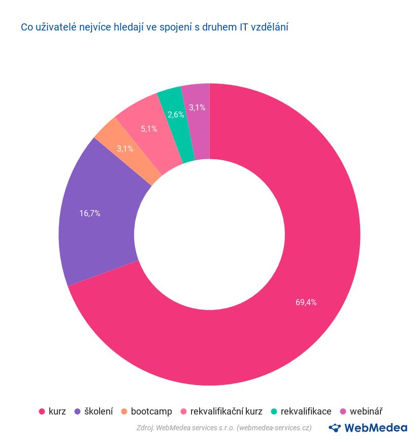 Pokud už zájemci o vzdělání vyhledávají formu studia IT na internetu, hledají nejčastěji spojení se slovem kurz či školení. Ze vzorku 3 600 slov je to konkrétně 69,4 %. V menší míře se objevují i další slova jako rekvalifikace, webinář či bootcamp. To může být ovlivněno tím, že slova nejsou v našem prostředí ještě přejatá nebo nám nejsou tyto formy studia tolik známe.