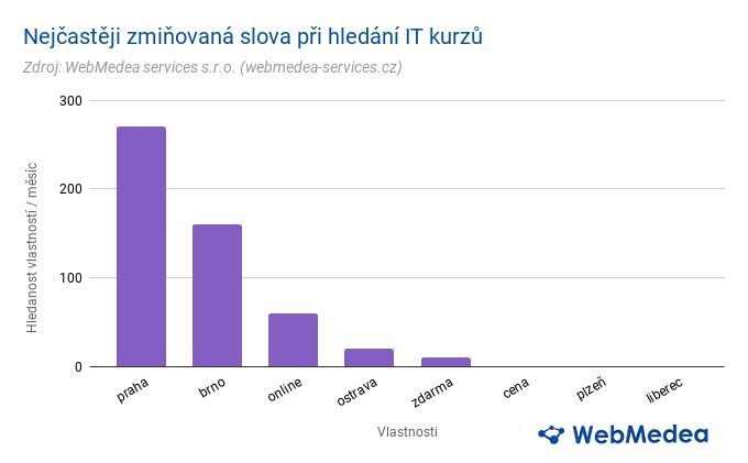 Pakliže chtějí být zájemci při hledání kurzů v IT konkrétnější, nejčastěji specifikují umístění. Kurzy jsou vyhledávány ve spojitosti se třemi největšími městy, a to Prahou, Brnem a Ostravou. Ve velké míře i online. Zajímavým zjištěním je určitě fakt, že vyhledávání podle ceny hraje vedlejší roli. Pouze minimálně, v jednotkách vyhledávání, bylo předmětem hledání slovní spojení ‚kurzy zdarma‘, tolik časté není ani vyhledávání kurzu v souvislosti s cenou. Lze tedy vyvodit, že za vzdělání v IT nemají Češi problém si připlatit.