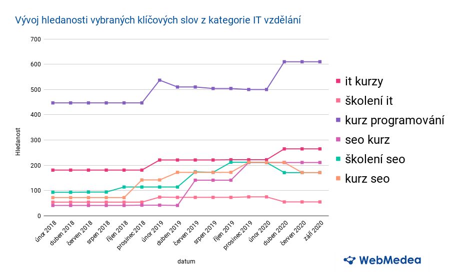 Není pochyb, že IT kurzy zažívají velký boom. Při jejich vyhledávání využívají Češi nejrůznějších slovních spojení. Nejvíce používaným je však ‘kurz programování‘ jehož vyhledávání je nejčetnější a stále se zvyšuje. Zvýšený nárůst zájmu o tyto kurzy koreluje především se začátkem tohoto roku, odkdy čelíme pandemii koronaviru.