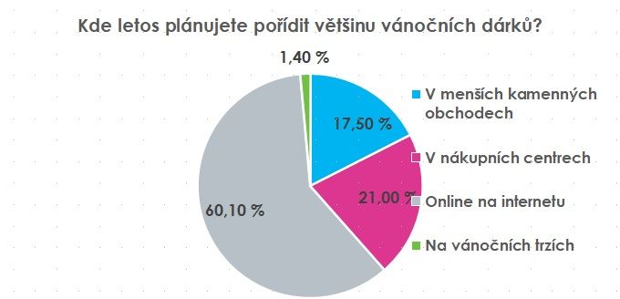 Maximálně do pěti tisíc Kč chce letos nakoupit dárky 60 % Čechů a od 5 tis. do 10 tis. Kč pak 30 % z nás. A kde tyto peníze utratíme? Je jasné, že řada věcí v našem životě i vánoční nákupy se ještě více přesunou do on-line světa. V e-shopech chce vánoční dárky pořídit 60 % Čechů (loni to bylo 50 %). A zatímco menším kamenným obchodům dává přednost letos stejný počet nakupujících jako loni – 17 % respondentů, klesá obliba velkých nákupních center. Letos zde chce pořídit vánoční nákupy 21 % Čechů, přičemž loni to bylo 30 %.