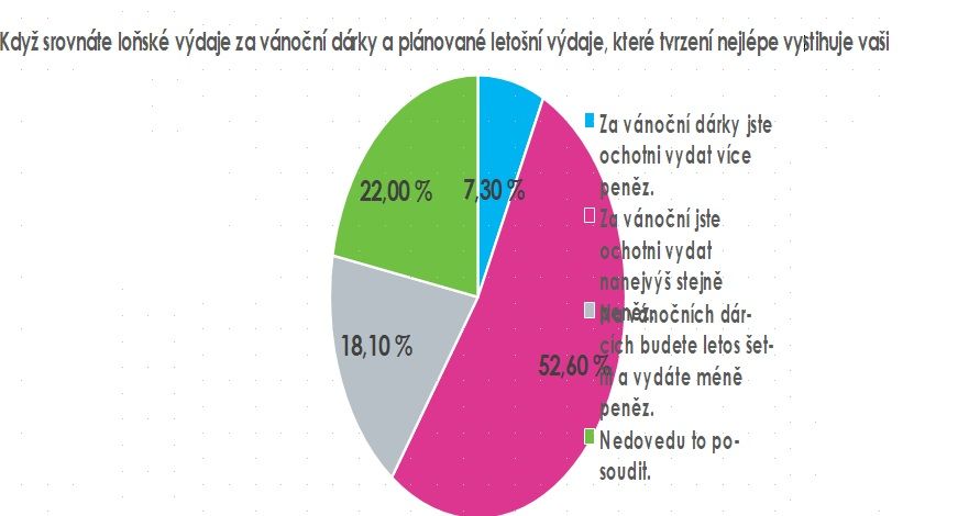 Jedno je jisté – letos se změní to, za kolik a kde budeme dárky nakupovat. Téměř pětina Čechů si myslí, že bude letos o Vánocích šetrnější a za vánoční dárky vydá méně něž loni. Polovina z nás je ochotná utratit za vánoční dárky maximálně tolik, co loni. A jen 7 % Čechů počítá s tím, že se „plácnou přes kapsu“ a do dárků investují více než loni. Nejistota ohledně finanční situace se promítá i do skutečnosti, že třetina Čechů není schopna nyní říct, zda plánuje na dárcích spíše šetřit či nakoupí dárky ve stejné hodnotě jako loni.