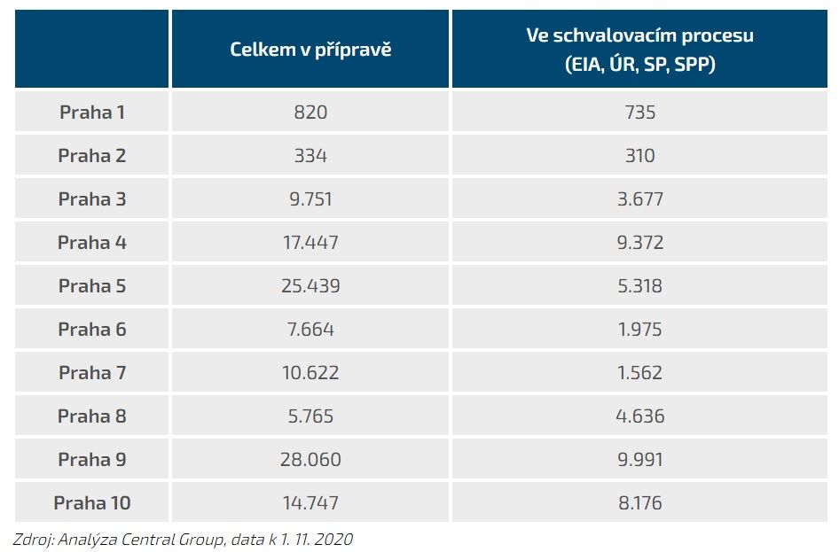V hlavním městě se nyní připravuje 120.649 nových bytů v 762 projektech. Jen necelých 40 % z nich již ale vstoupilo do některé z fází schvalovacího procesu. Největší rozvoj do budoucna čeká Prahu 9, 5 a 4, kde se nachází velké množství brownfieldů. Na těch leží budoucnost Prahy. Plánovány jsou na nich téměř dvě třetiny ze všech připravovaných nových bytů. Hlavním problémem Prahy však nadále zůstává, že se byty nedaří v dostatečném počtu schvalovat. Vyplývá to z analýzy největšího rezidenčního stavitele Central Group.
