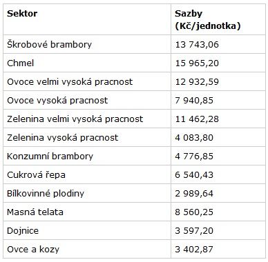 Ministr zemědělství schválil následující sazby pro jednotlivé citlivé komodity, jejichž prostřednictvím bude čerpána celková roční obálka ve výši necelých 3,3 mld. Kč.