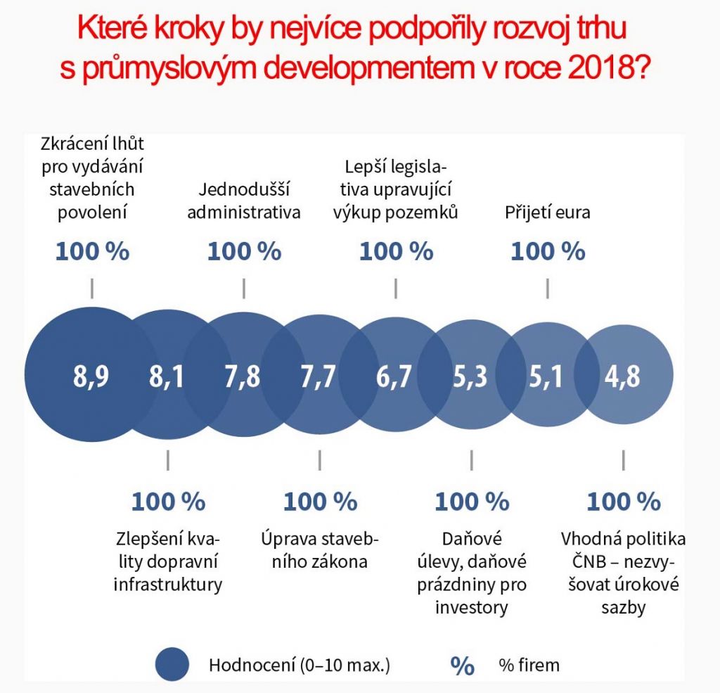 Podle ředitelů developerských společností by rozvoji trhu s průmyslovým developmentem v příštím roce nejvíce pomohlo zkrácení lhůt pro vydávání stavebních povolení. Na stupnici od nuly do desítky, kde desítka představuje faktor maximálně podporující rozvoj průmyslového developmentu v ČR, ohodnotili tuto možnost průměrnou známkou 8,9 bodu z 10. K dalším důležitým krokům patří zlepšení kvality dopravní infrastruktury (8,1 bodu z 10), zjednodušení administrativy (7,8 bodu z 10) a úprava současného stavebního zákona (7,7 bodu z 10). Naopak nejméně by podle ředitelů developerských společností průmyslový development podpořila vhodnější politika ČNB, konkrétně například nezvyšování úrokových sazeb (4,8 bodu z 10).