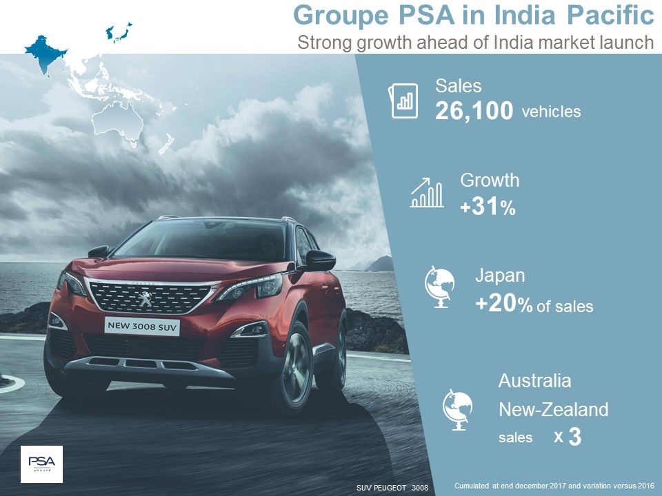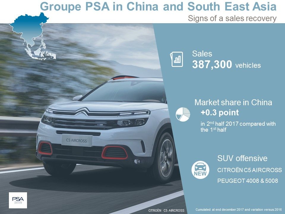 Skupina v obtížném kontextu prodala v Číně a jihovýchodní Asii 387 000 vozidel. Prvními známkami obchodního oživení, které skupina zaznamenává, je zvyšování měsíčních prodejů od července a zvýšení podílu na trhu ve druhém pololetí o 0,3 procentního bodu oproti prvnímu pololetí. Nabídka SUV se setkala s úspěchem, v roce 2017 byl na místních trzích zahájen prodej vozů Peugeot 4008 a 5008 a Citroën C5 Aircross. Je třeba poznamenat, že Nový Peugeot 308 a vozy Citroën C5 a C6 vykazují oproti roku 2016 stabilní objemy navzdory segmentu trhu, který zaznamenává pokles.