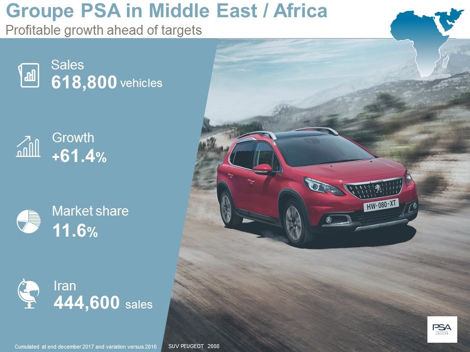 Rok 2017 byl také významný zahájením výroby a prodeje SUV 2008 v Íránu a v případě značky Citroën vytvořením íránského společného podniku se společností Saipa na místě Kashan. Skupina zde dále rozvíjí své výrobní aktivity. V roce 2017 došlo k položení základního kamene továrny Kenitra v Maroku, zahájení výroby v Keni a Etiopii a podepsání protokolu o souhlasu se zřízením nové továrny v alžírském Oranu.