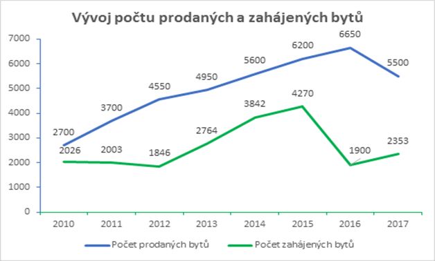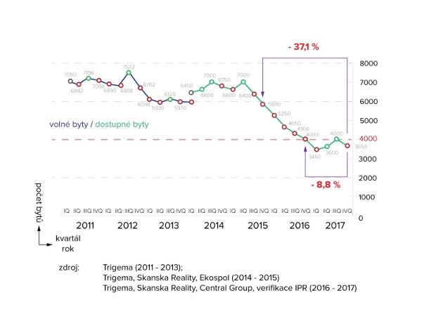 Před dvanácti měsíci se počet nových bytů pohyboval na hranici 4 000 jednotek. Ke konci prosince to však bylo již pouze 3 650 bytů, potvrzuje studie společností Trigema, Skanska Reality a Central Group. Nejméně se jich nabízelo ke konci prvního kvartálu loňského roku, kdy bylo na trhu 3 400 bytů. Nejvíce bytů bylo v posledním období na konci druhého čtvrtletí roku 2015. V nabídkách se tehdy v jednu chvíli nacházelo až okolo 7 000 jednotek.