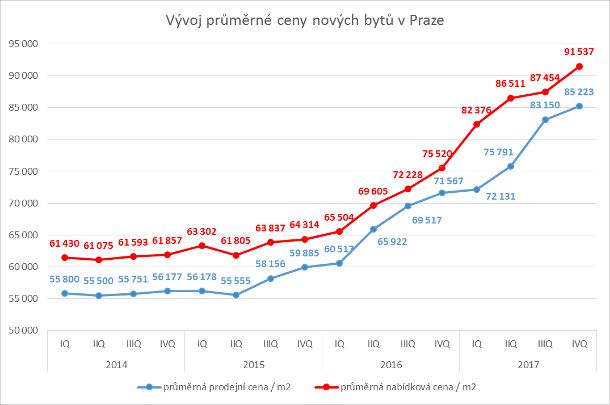 Druhé čtvrtletí roku 2015 bylo momentem, od kdy průměrné ceny za nově prodané byty postupně rostou. Zatímco v polovině uvedeného roku se tyto ceny pohybovaly mírně nad hranicí 55 000 korun za m2, ke konci loňského prosince pak byly již ve výši 85 223 korun za m2. To znamená, že od tohoto období vzrostly o zhruba 55 procent! V meziročním porovnání jsou loňské prodejní ceny vyšší o téměř 20 procent. Na konci roku 2016 dosahovala totiž průměrná cena za nový byt ještě výše 71 567 Kč na m2, zjistila analýza.