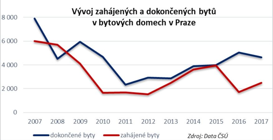 Zahájené byty neboli ty, na něž úřady vydaly stavební povolení, naznačují vývoj nabídky na trhu v následujících obdobích. A rozhodně nás tedy nečeká žádný boom. Již dnes je nabídka nových bytů na trhu na hranici 3600 bytů, což je pro město, jakým je Praha, zcela nedostatečné. Novinkou ale je, že po letech růstu od odeznění ekonomické krize se začínají propadat i počty dokončených bytů o více než osm procent na 4623 dokončených bytů. Problém, na který developeři poukazují již déle než rok, se tak nyní začíná ukazovat naplno.